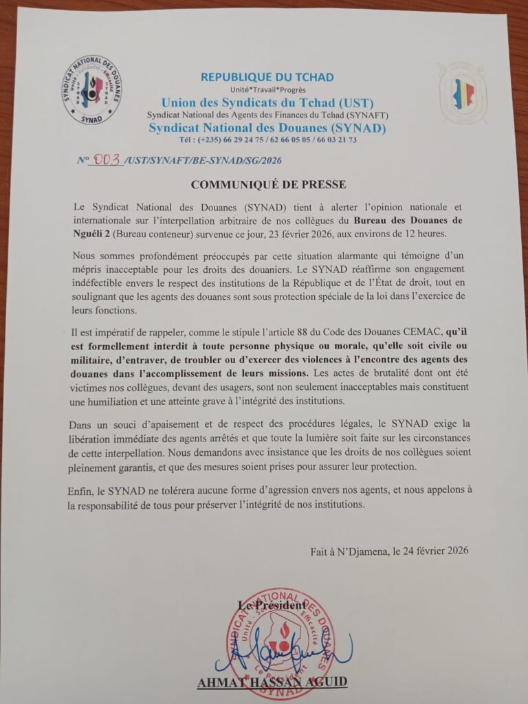 Dans un communiqué rendu public le 24 février 2026 à N’Djamena, le SYNAD qualifie cette interpellation d’« arbitraire » et exprime sa vive préoccupation face à ce qu’il considère comme une atteinte aux droits des agents dans l’exercice de leurs fonctions.