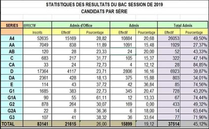 Une nette amélioration sur le taux de pourcentage cette année, 45,12% soit 37 514 candidats toutes séries confondues.