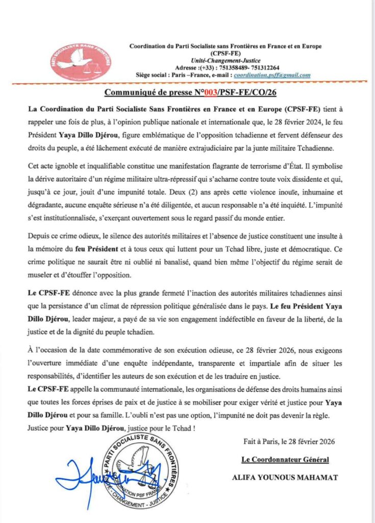 La Coordination du Parti Socialiste Sans Frontières en France et en Europe (CPSF-FE) a publié, le 28 février 2026 à Paris, un communiqué de presse (N°003/PSF-FE/CO/26) marquant le deuxième anniversaire du décès de l’opposant tchadien Yaya Dillo Djérou.