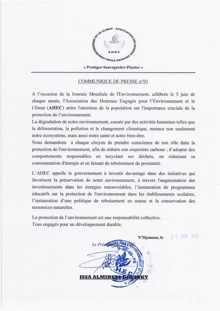 Placée sous le thème « Protéger – Sauvegarder – Planter », cette journée mondiale est l’occasion, pour l’AHEC, de rappeler que la protection de l’environnement conditionne l’avenir des générations futures. Elle appelle donc à une mobilisation générale pour un Tchad plus vert et résilient face aux défis climatiques.