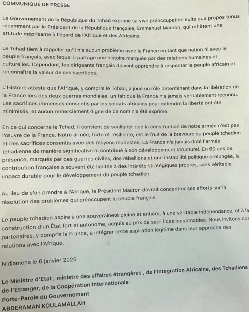 Dans un communiqué officiel publié ce 6 janvier 2025, le Gouvernement de la République du Tchad a vivement critiqué les déclarations récentes du Président français Emmanuel Macron. Selon le communiqué, ces propos témoigneraient d’une attitude méprisante à l’égard de l’Afrique et de ses peuples.