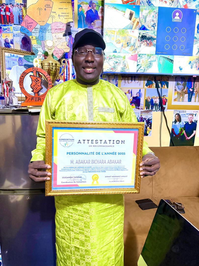 Le Consortium des médias digitaux, composé de Tachad.com, Rafigui Média,Tchad Échos, Al-Balad Medias, Sentinelle.td etc. a décidé, en toute souveraineté et indépendance, de consacrer M. Abakar Bichara, Président du Conseil d’Administration de American Happiness Academy (AHA), Personnalité de l’année 2025, la remise officielle de l’attestation de reconnaissance a eu lieu ce mercredi 28 janvier 2026.