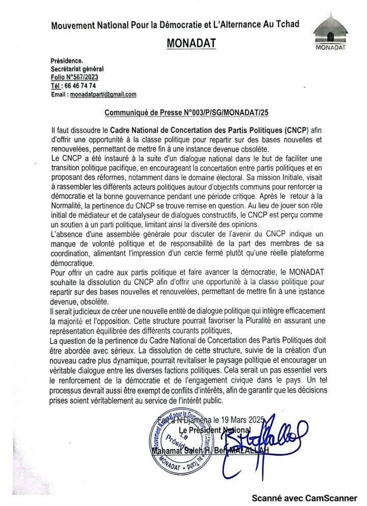 Le président national du MONADAT, Mahamat Saleh Ben Malallah, dénonce notamment l’absence d’assemblée générale depuis plus d’un an, le manque de coordination interne et l’impression d’un cercle fermé, loin des aspirations des citoyens. « Le CNCP est devenu un organe sans dynamisme ni représentativité, alimentant frustrations et immobilisme politique », affirme-t-il dans le communiqué.