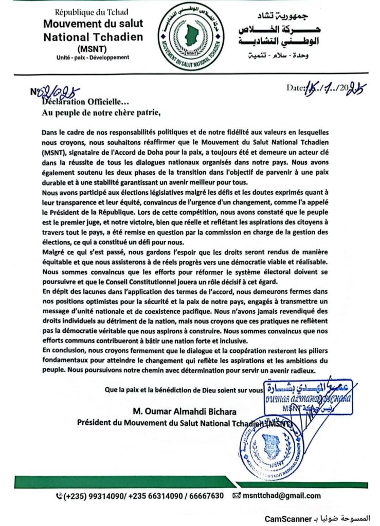 Avec cette déclaration, le MSNT appelle l’ensemble des acteurs politiques et sociaux à maintenir le cap vers une paix durable et une véritable démocratie au Tchad.