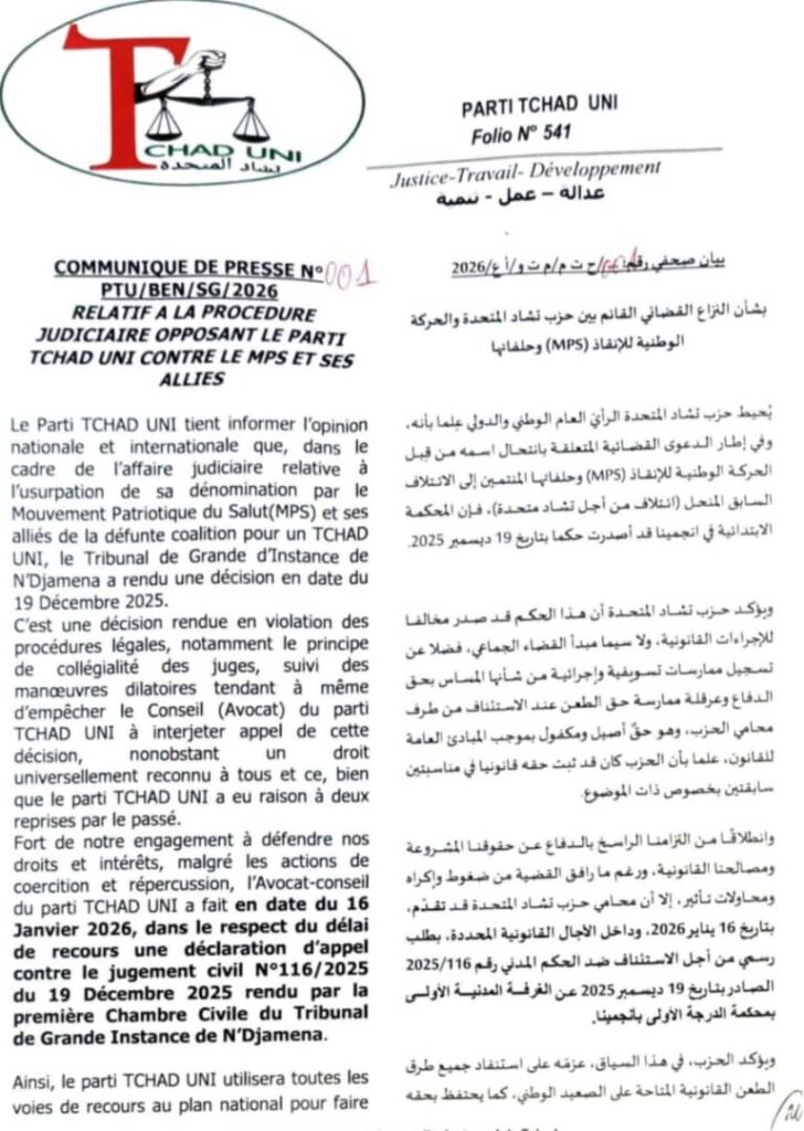 Pour défendre les droits et intérêts du parti, Mahamat Zene Cherif annonce que l’avocat-conseil du TCHAD UNI a déposé le 16 janvier 2026 un recours en appel contre le jugement civil n°116/2025 rendu par la première chambre civile du tribunal. Le parti affirme qu’il exploiterait toutes les voies de recours nationales et, si nécessaire, saisira les juridictions internationales compétentes.