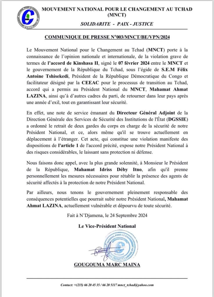 Le Mouvement National pour le Changement au Tchad (MNCT) a publié un communiqué de presse urgent le 24 septembre 2024, dénonçant une violation grave de l’accord de Kinshasa II, qui met en péril la sécurité de leur Président, Mahamat Ahmat Lazina.
