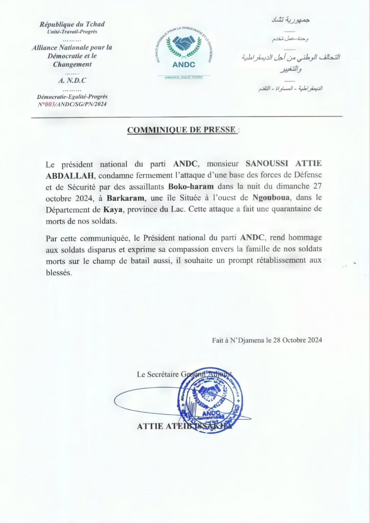 Dans un communiqué officiel publié ce lundi, 28 octobre le président de l’Alliance Nationale pour la Démocratie et le Changement (ANDC), Monsieur Sanoussi Attie Abdallah, a exprimé sa vive condamnation suite à une attaque violente perpétrée par le groupe terroriste Boko Haram. L’assaut, survenu dans la nuit du 27 octobre à Barkaram, une île de la province du Lac, a coûté la vie à une quarantaine de militaires tchadiens.