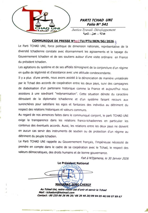 Le parti politique TCHAD UNI a vivement critiqué, dans un communiqué publié le 30 janvier 2026, l’agitation politique et médiatique entourant la récente visite du président tchadien en France, qualifiée de « visite ordinaire » par la formation politique.