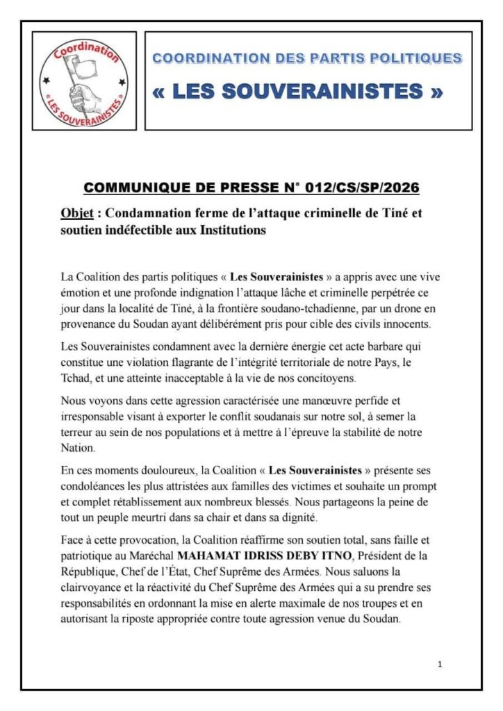 La coalition politique « Les Souverainistes » a fermement condamné l’attaque de drone survenue le 18 mars 2026 dans la localité de Tiné, à la frontière tchado-soudanaise, ayant visé des civils.