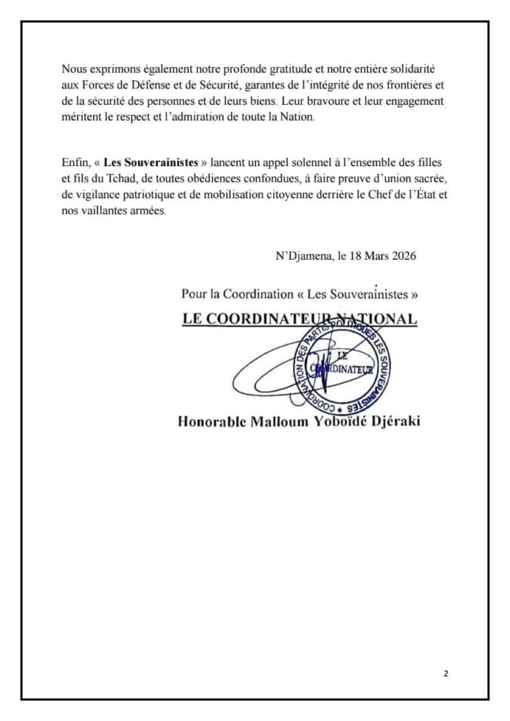 Le communiqué est signé par le Coordonnateur national de la coalition, Honorable Malloum Yoboïdé Djéraki.