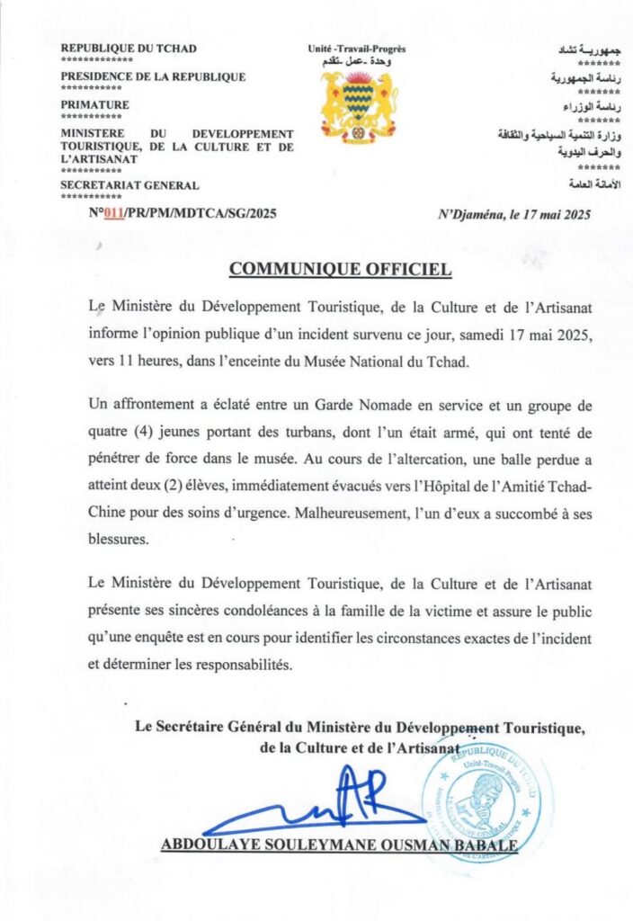 Ce qui devait être une simple sortie éducative s’est terminé dans l’horreur. Le Musée national du Tchad, lieu de mémoire et de découverte, a été le théâtre d’un événement tragique ce samedi 17 mai 2025, aux environs de 11 heures.