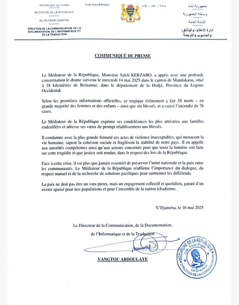 Face à cette tragédie, le Médiateur de la République, Saleh KEBZABO, a exprimé sa profonde consternation et a adressé ses condoléances les plus attristées aux familles endeuillées, tout en souhaitant un prompt rétablissement aux blessés.